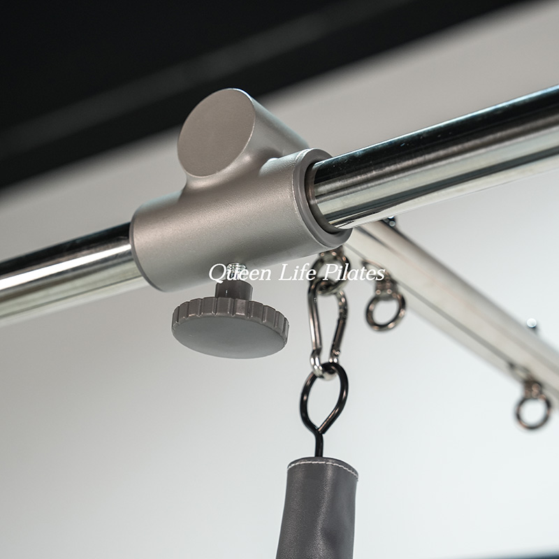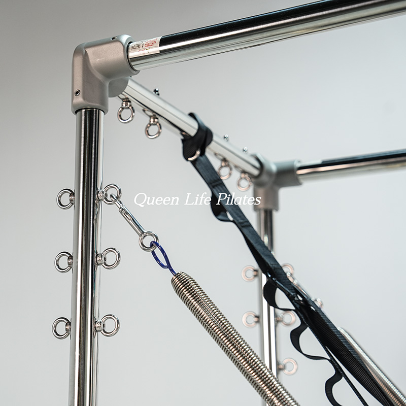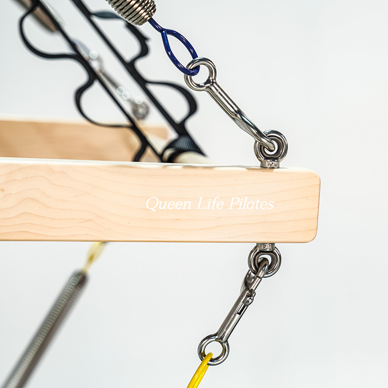 The bed frame is made of North American white maple wood, the leather surface is made of marine fiber leather, and the inner layer is soft sponge. The tower frame is made of 304 stainless steel tubes, the push rod is made of silver-white aluminum alloy with wooden crossbars, and the push rod has four height adjustments. The standard configuration includes 8 Korean springs, 4 long and 4 short. The standard configuration includes a strap, a pair of fluffy straps, the fluffy straps are made of solid fluffy material, which is very soft and thick. The standard configuration also includes a adjustable-length leg strap, a safety belt, a pair of single-ring pull straps, a horizontal sponge panel, a headrest.